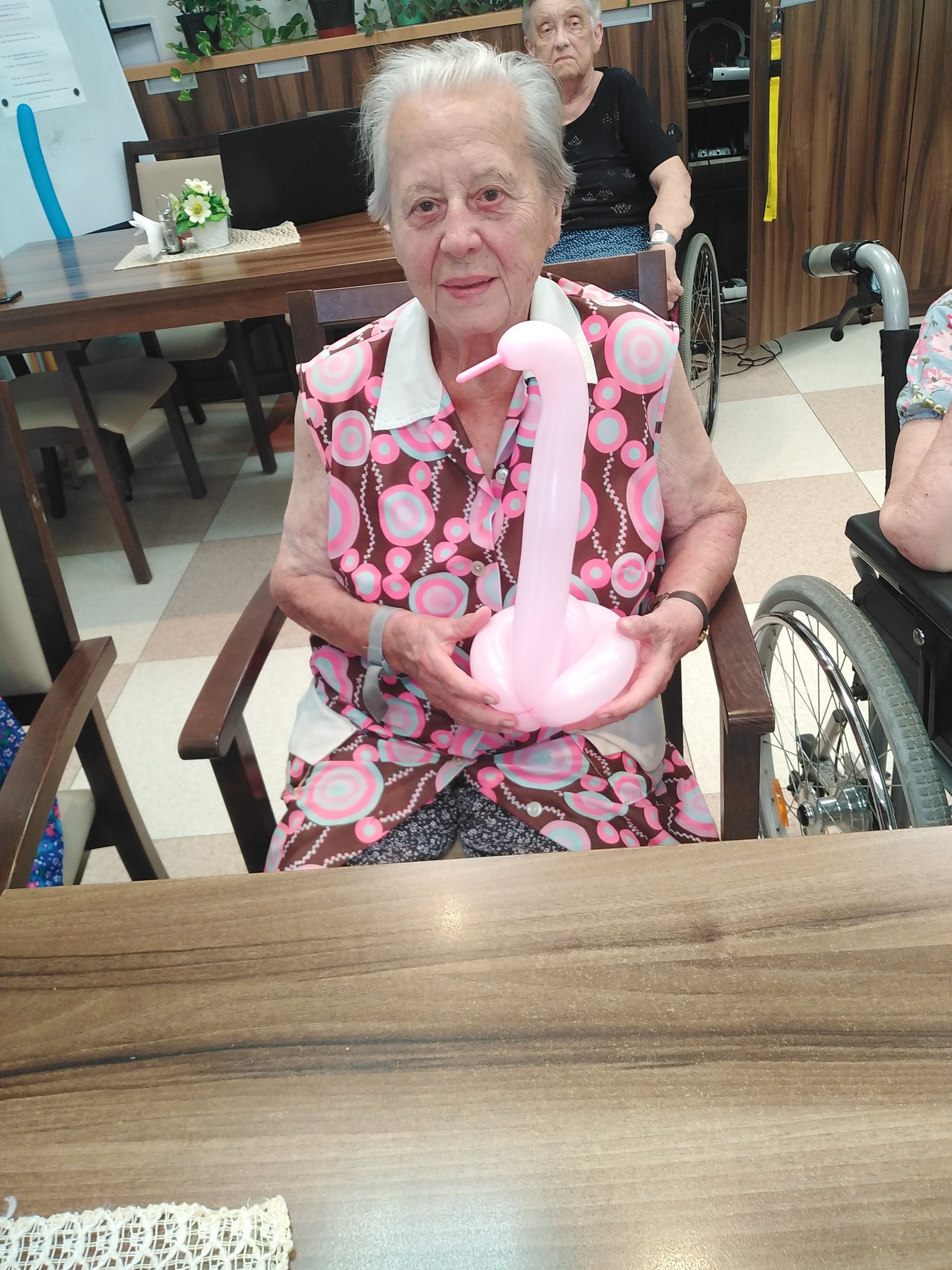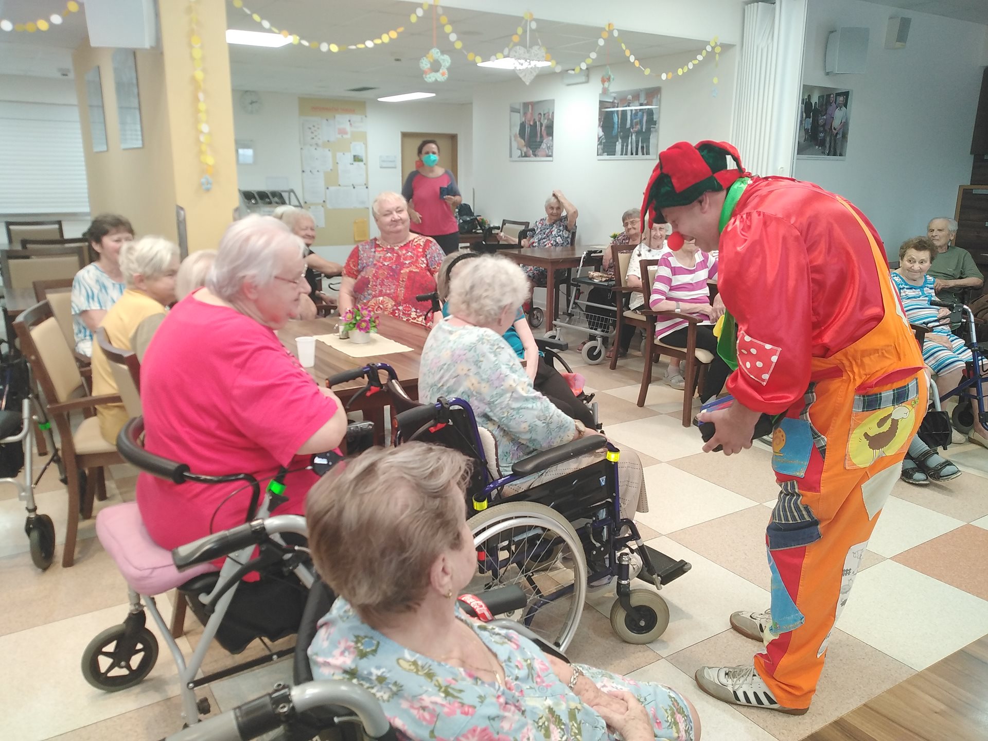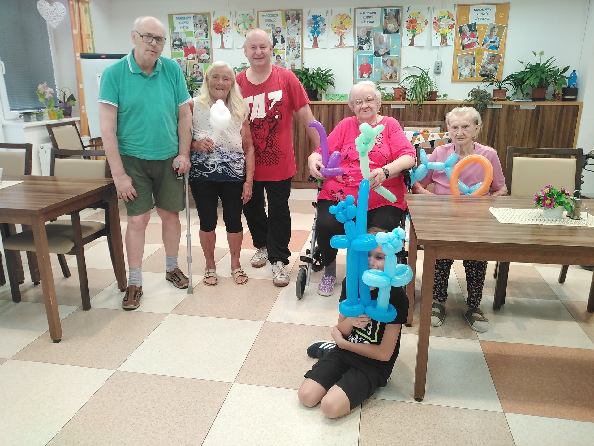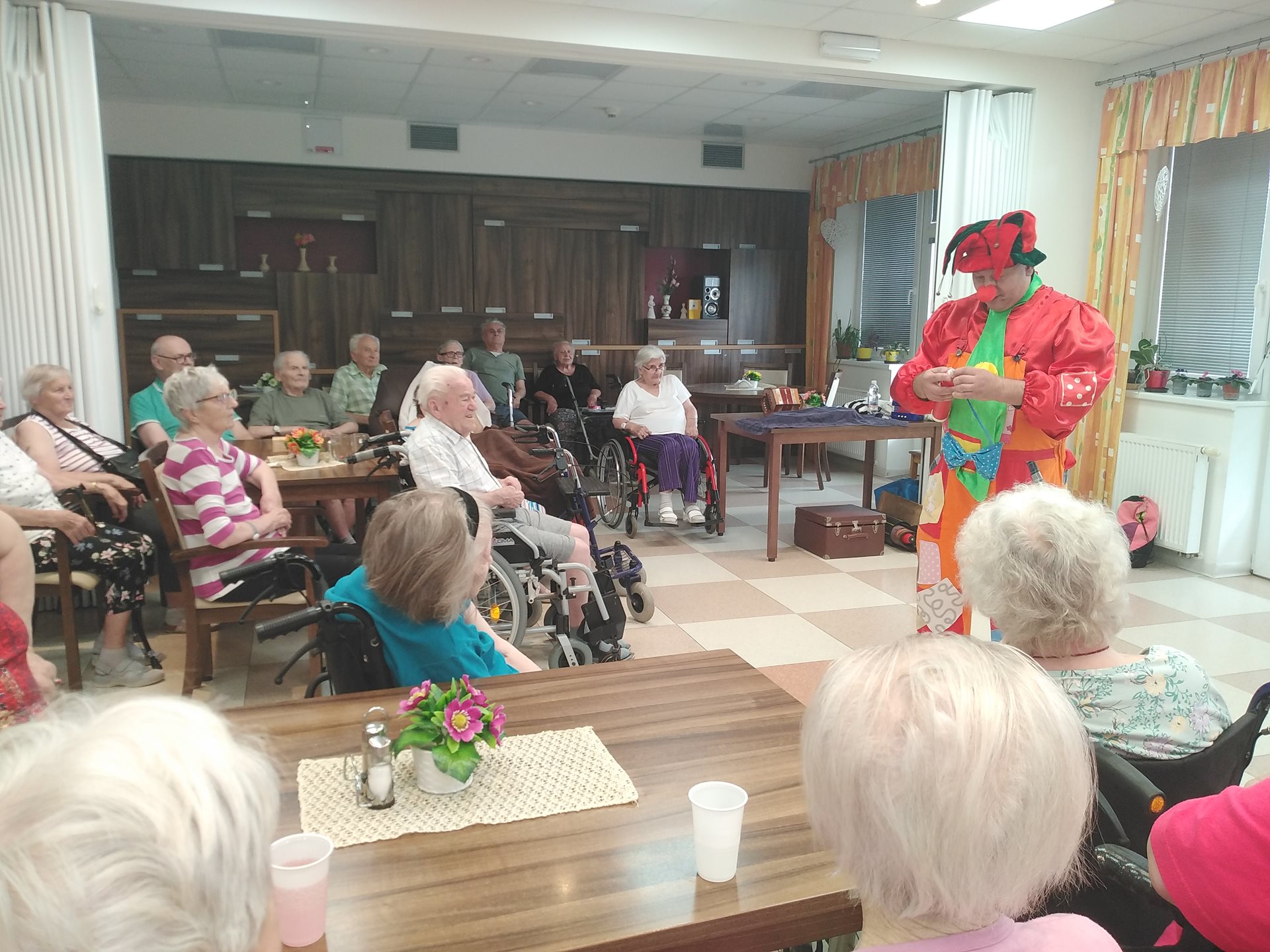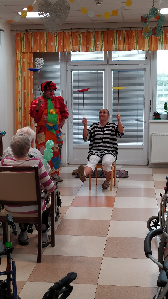 Dne 19.08.2022 se naši klienti mohli přenést zpět do dětských let zásluhou klaunského vystoupení pana Bohouše Kubise. Pan Kubis klientům předvedl akrobatické kousky do kterých zapojil i aktivizační pracovnici. V rámci vystoupení pan Kubis vytvářel z balónků různé předměty jako květiny nebo zvířátka, které potěšily naše klienty.