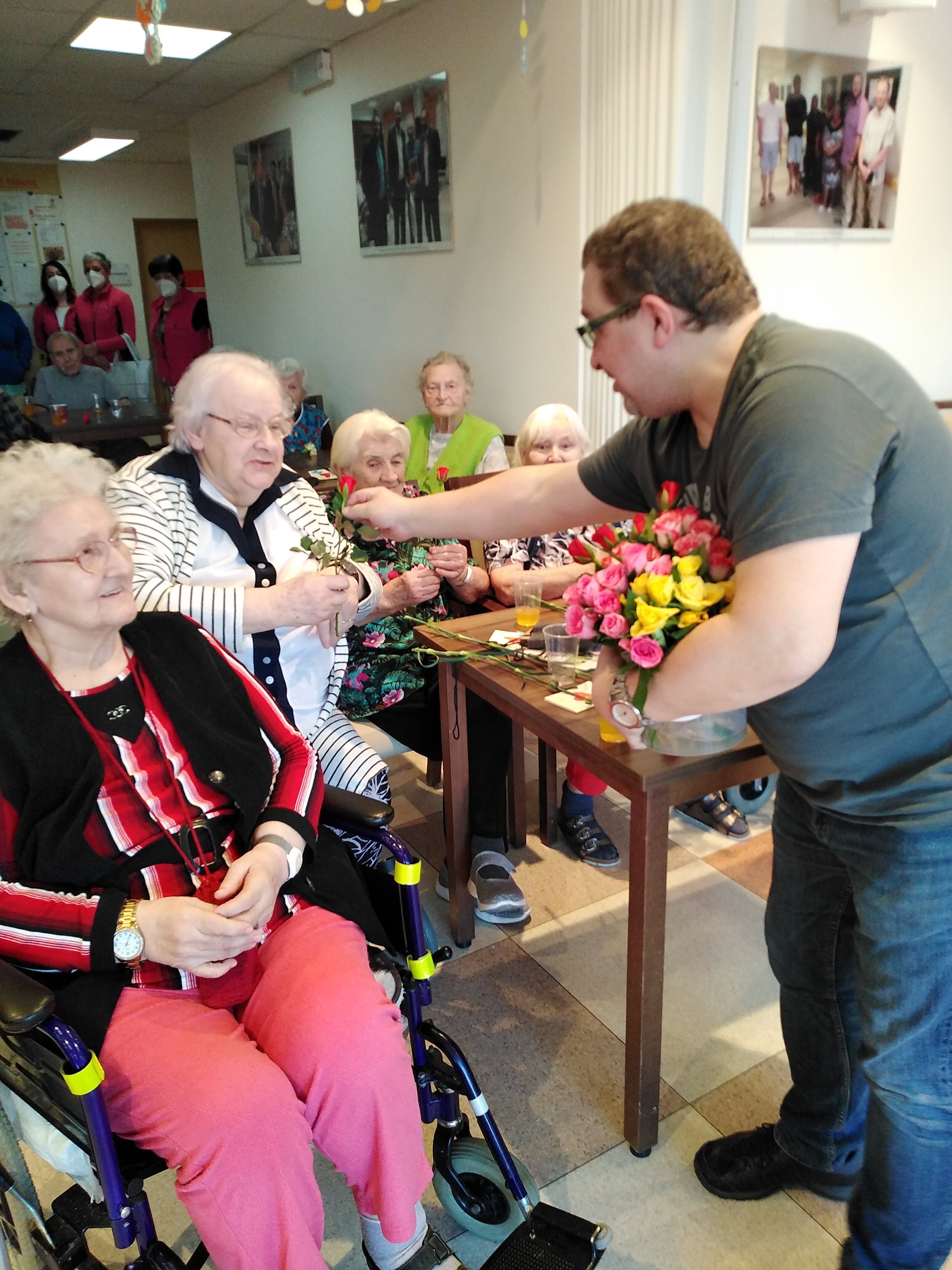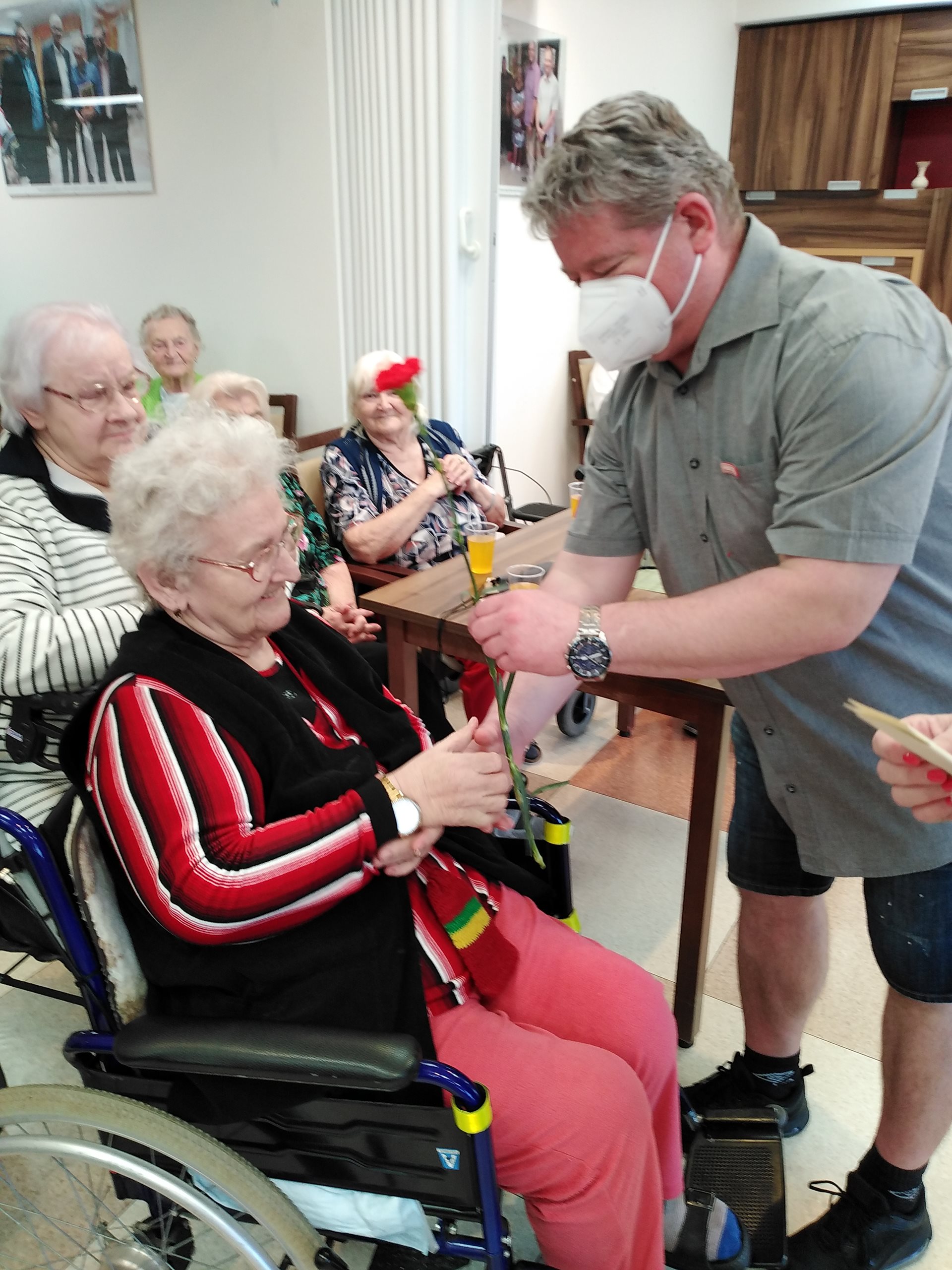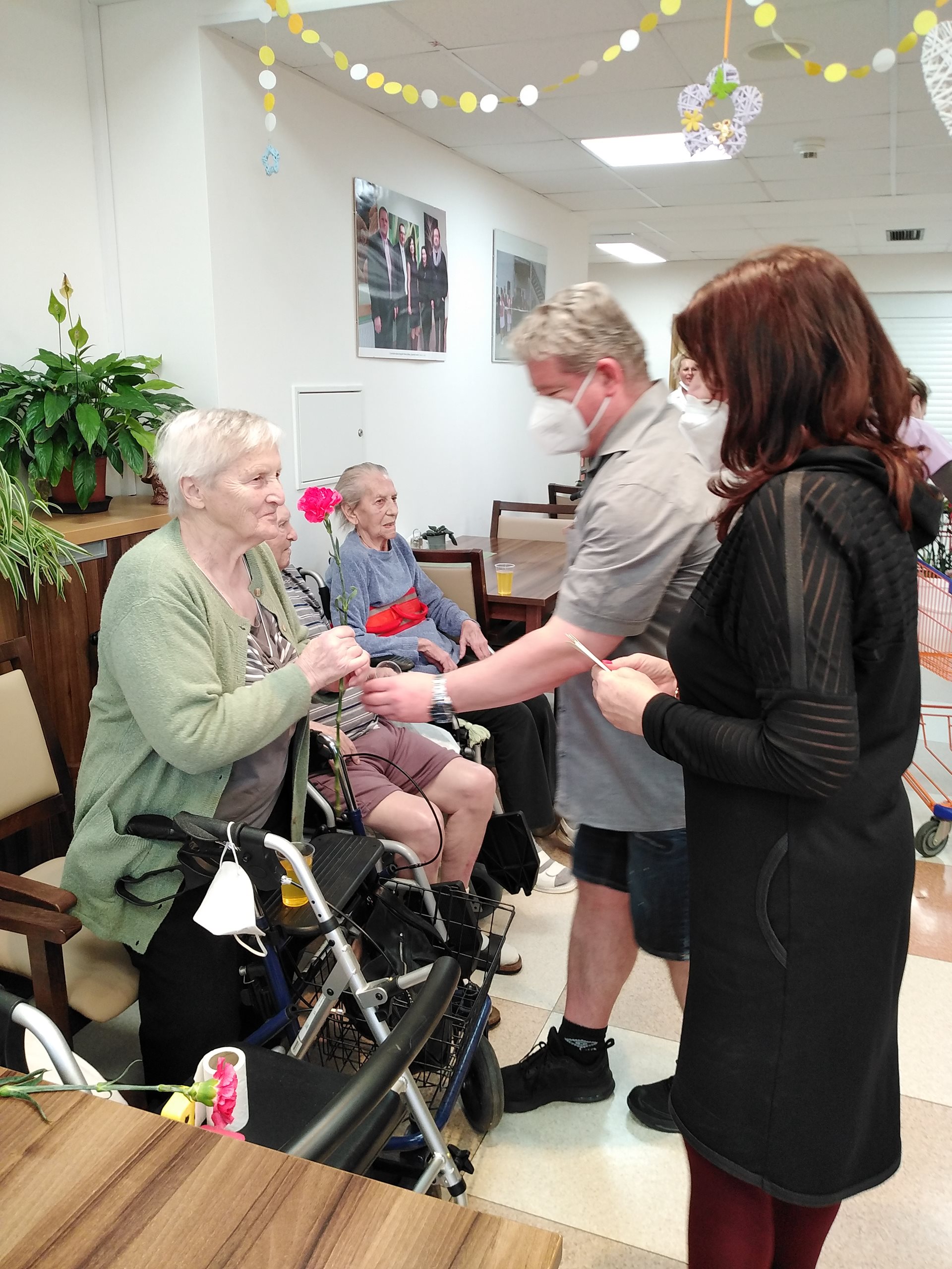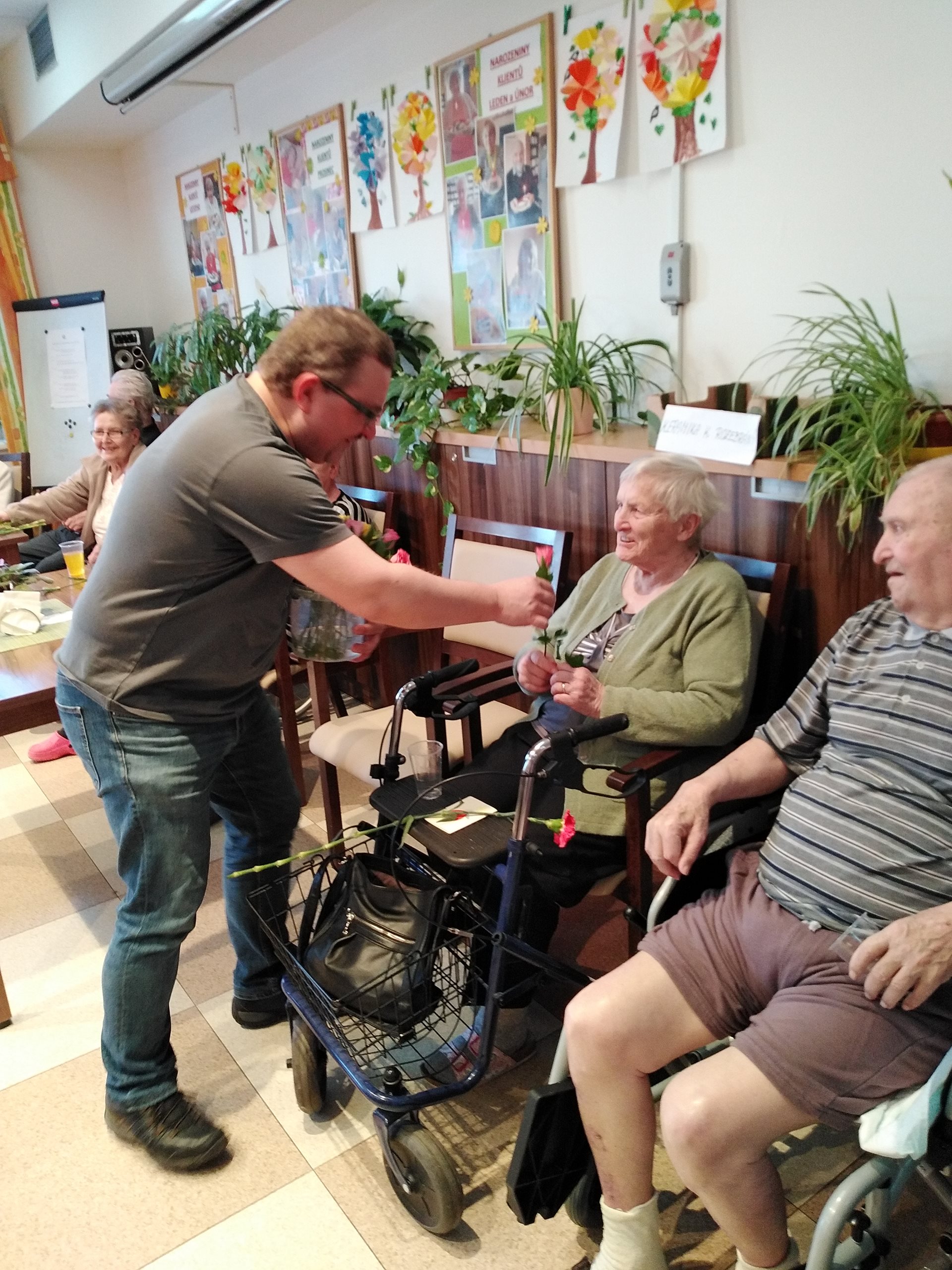 Oslava MDŽ proběhla 8.3.2022. V dopoledních hodinách zástupce ředitelky, pan Vaňout, společně s naším klientem panem Magulou, obdarovali květinami naše zaměstnankyně a též na pokojích a v jídelně probíhalo předání květin a přáníček od dětí za účasti paní ředitelky PhDr. Jitky Synkové. Všichni klienti dostali k obědu zákusek od pana Jiráska a od 14:30 v jídelně Domova probíhalo hudební vystoupení pana Krulicha. Po skončení hudebního vystoupení měl pan Krulich připravené překvapení v podobě růží, které rozdal všem ženám.