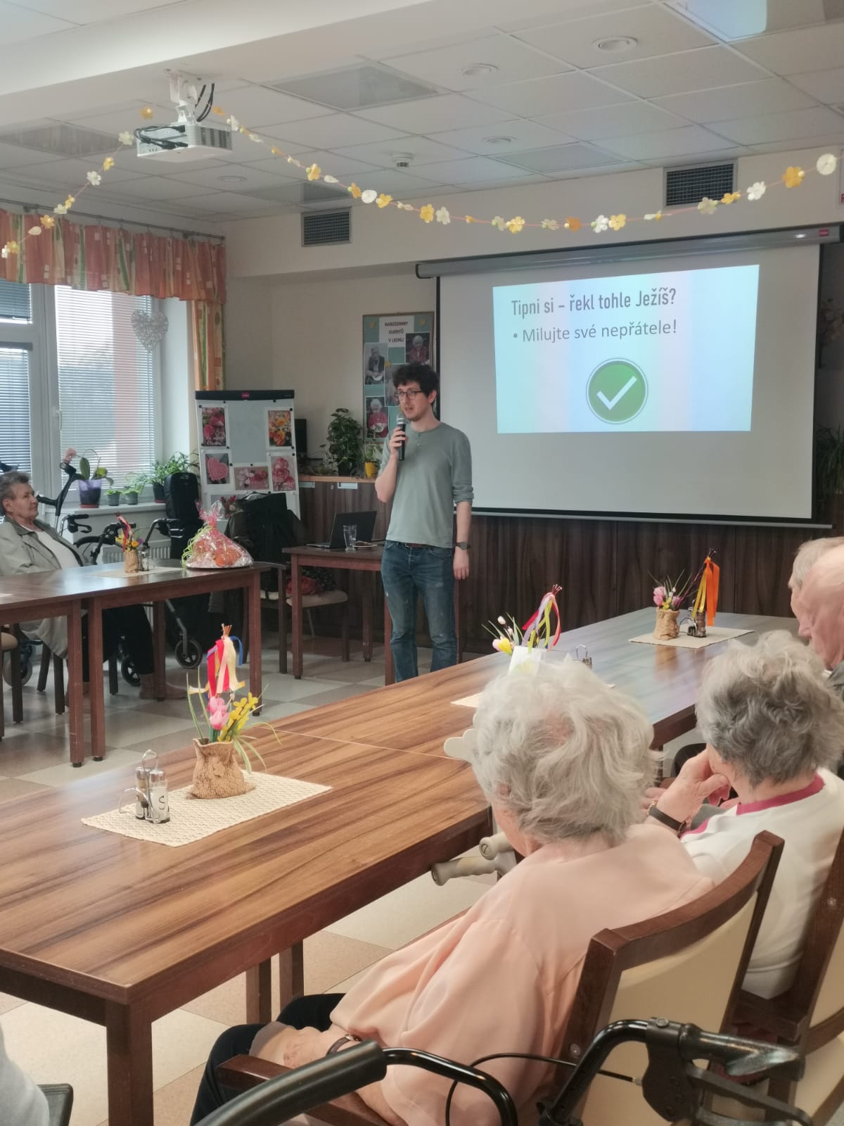 Na Velký pátek nás navštívil evangelický pastor Jordan Tomeš, který si připravil povídání s tematikou významu Velikonoc. Celou akci oživil hádankami citátů z Bible a projekcí na velkém plátně. Klienti se aktivně zapojili a znali množství pořekadel a přísloví.